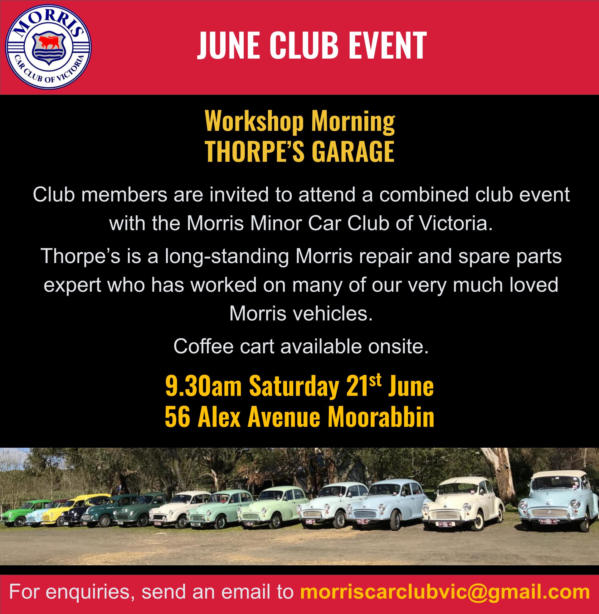 Saturday 21st - Thorpe’s Morris Minor workshopA combined club event with the Morris Minor Car Club of Victoria to Thorpe's garage, a Morris repair and spare parts expert. Starting time 9.30am.